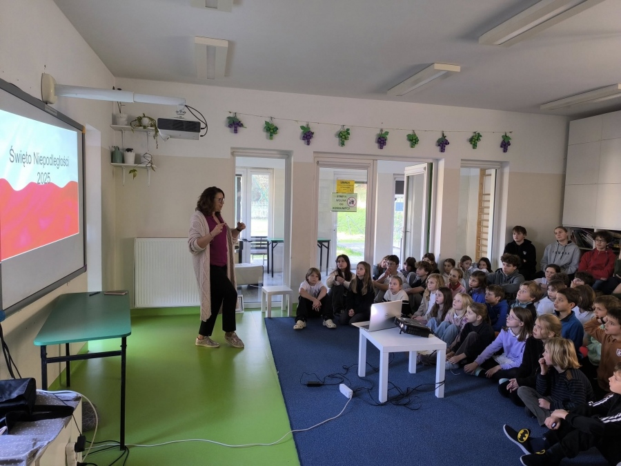 Uroczystość rozpoczęliśmy od odśpiewania hymnu państwowego, po czym pani Iza w ciekawy sposób opowiedziała nam o historii odzyskania niepodległości przez Polskę.