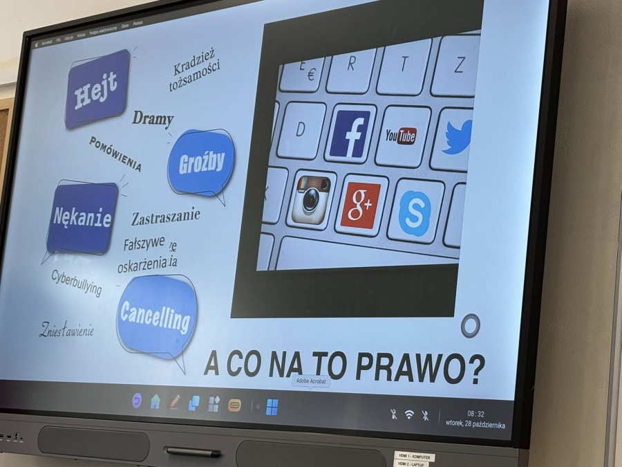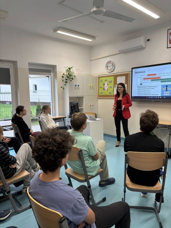 W ramach akcji ?Prawnicy rozjaśniają prawo? organizowanej przez Naczelną Radę Adwokacką uczniowie klas siódmej i ósmej spotkali się z panią mecenas Eweliną Poslajko. Tematem spotkania był hejt i jego prawne aspekty ( również te dotyczące osób nieletnich). Dziękujemy za przekazanie ważnych informacji oraz przybliżenie tego, czym (między innymi) zajmuje się osoba wykonująca jeden z zawodów prawniczych.